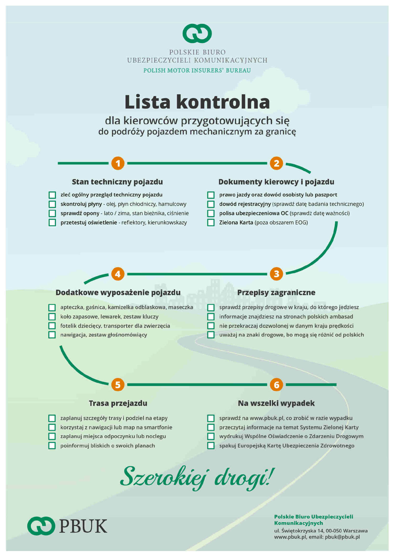 Dlatego Polskie Biuro Ubezpieczycieli Komunikacyjnych przygotowało specjalną listę kontrolną dla kierowców przygotowujących się do podróży pojazdem mechanicznym za granicę. Dzięki niej dopięcie wyjazdu na ostatni guzik będzie łatwe i szybkie. Można ją pobrać ze strony internetowej PBUK: Lista kontrolna dla kierowców.