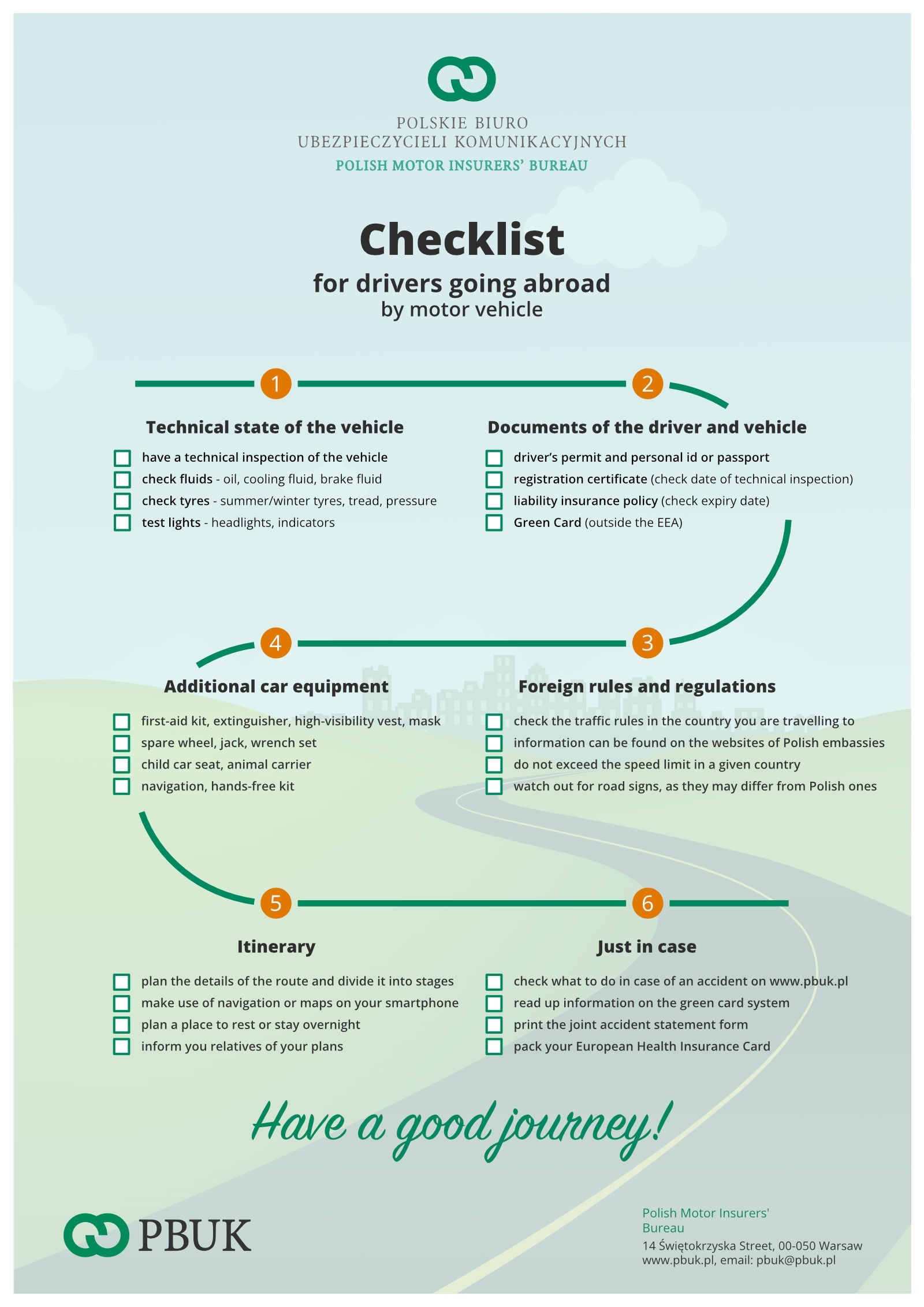 That is why the Polish Motor Insurers' Bureau has prepared a special checklist for drivers preparing to travel abroad by motor vehicle. It will make putting the finishing touches to your trip quick and easy.